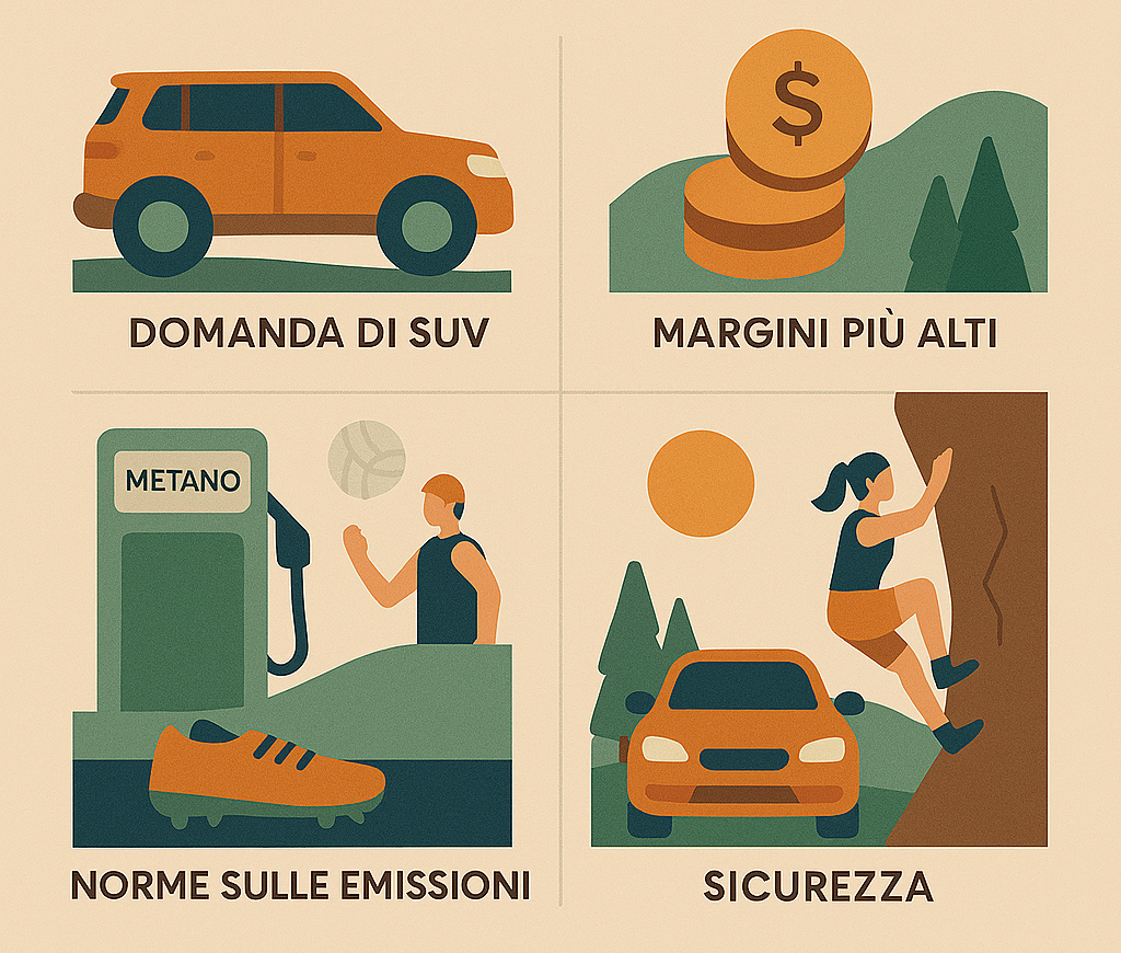 - Sicurezza stradale: In un impatto tra un veicolo leggero e un SUV pesante, chi si trova nel veicolo leggero corre rischi molto più elevati.